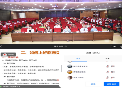 本次培训特别邀请了西安交通大学第一附属医院刘昌教授、柏宏亮教授,陕西省人民医院段降龙教授,以及我校严琴琴教授、李晟副教授、王晓龙博士共6名专家教授分别从各自学科领域的专业角度出发,围绕临床思维、课程设计、临床示范课以及信息技术与教学的融合等方面进行授课。6位专家授课形式丰富多样、实用收益、参训教师热情高涨,积极与授课专家进行提问互动,现场气氛热烈,受到了教学基地线上、线下临床教师们的一致好评。