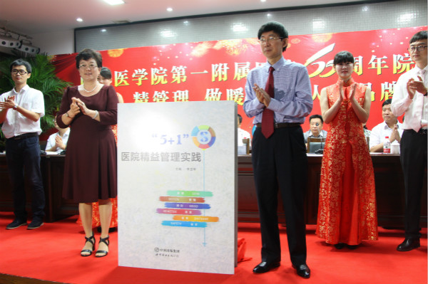 第一附属医院院长李亚军主编《“5+1”S医院精益管理实践》一书并且分享了“5+1”S理论及医院精益管理实践经验;台北医学大学万芳医学中心常务副院长、著名医院管理专家朱子斌教授为新书做推介,他表示医院在管理方面取得的大量成就离不开院领导的战略眼光及全院职工的精诚团结,不仅将5s落到实处,更是创新的将“安全”要素加入活动中,形成富有特色的“5+1”S。在这个过程里,由质变到量变,从而不断提高工作质量,确保了医疗质量安全。这本书完成了一个非常新的经验总结,每一个步骤都总结到位,他希望在座的嘉宾能够通过这本书将医院的环境工程、人文素质工程、质量文化工程做到位,同时他相信第一附属医院结合专业特色与管理创新发展道路将会更加迈向国际化。随后,副院长弥曼与李亚军教授共同为新书揭牌发布。