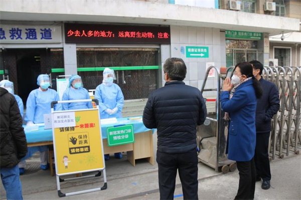 熊冬梅副书记一行查看了发热门诊、预检分诊处等情况并慰问了现场工作人员,鼓励他们坚定信念、做好防护、坚决打赢疫情防控阻击战;现场听取了医院对疫情防控救治工作情况的汇报,询问了一线医务人员及其家属保障工作落实情况,充分肯定了医院疫情防控和救治工作并指出:“当前防控工作已进入最为关键的时期,希望全院医务工作者要以‘万众一心、众志成城,不畏艰险、百折不挠’的精神,投入这场没有硝烟的抗疫战役,医院要全力做好医务人员防护、疫情防控救治工作,进一步细化落实一线医务人员及其家属保障”。