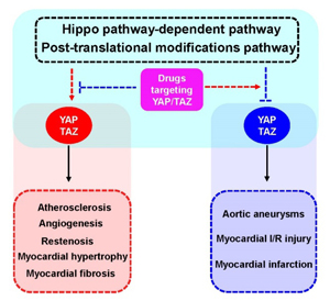 心血管疾病(CVDs)是死亡率和发病率最高的疾病之一,是全球主要的公共卫生问题,CVDs的发病机制及治疗策略是目前医学研究的热点。探寻新的心血管病潜在治疗靶点是我校陈玉龙副教授团队研究的主要方向,作为转录共激活子YAP和TAZ能够通过与转录因子(TEADs)相互作用调控细胞的增殖、迁移、分化和凋亡。极性和链接蛋白、机械应力以及G蛋白偶联受体均可通过Hippo pathway依赖途径调控YAP和TAZ 活性。另外,蛋白后修饰(如磷酸化、糖基化、乙酰化、甲基化、香叶酰化和棕榈酰化)也能够直接调控YAP和TAZ 活性。 YAP和TAZ最近被认为参与了血管和心脏疾病的病理过程。YAP和TAZ的激活能够促进动脉粥样硬化、血管生成、再狭窄、肺动脉高压、心肌肥厚和心肌纤维化,而YAP和TAZ的抑制能够参与主动脉瘤、主动脉夹层、心肌缺血再灌注损伤和心肌梗死。因此,YAP和TAZ均有可能成为治疗心血管疾病的潜在靶点。本文系统讨论了有关YAP和TAZ的最新发现,为团队的下一步研究明确了方向,并得到了国际同行的高度认可。(党委统战部 文/图 陈玉龙 审核/万家峰)