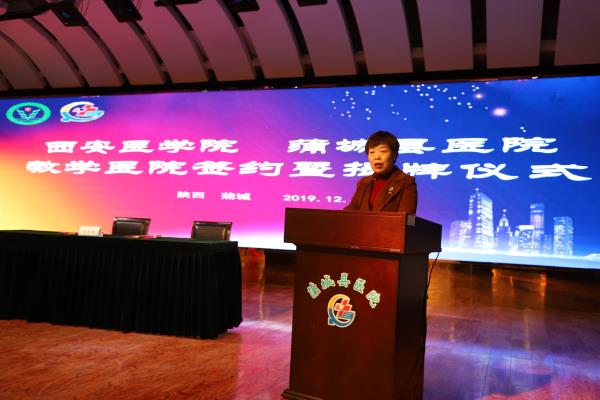 仪式结束后,副院长李雪萍作了重要讲话,此次我校全科医学专业与蒲城县医院的教学合作,是贯彻落实习近平同志在党的十九大报告中提出“实施健康中国战略”的精神,促进陕西全科医学的发展,为陕西培养更多更优秀的全科医疗人才。通过教学相长的作用,为医院的发展和提升起到重要的促进作用。祝愿双方合作成功,并祝愿蒲城县医院在医教研多方面取得成绩和发展。