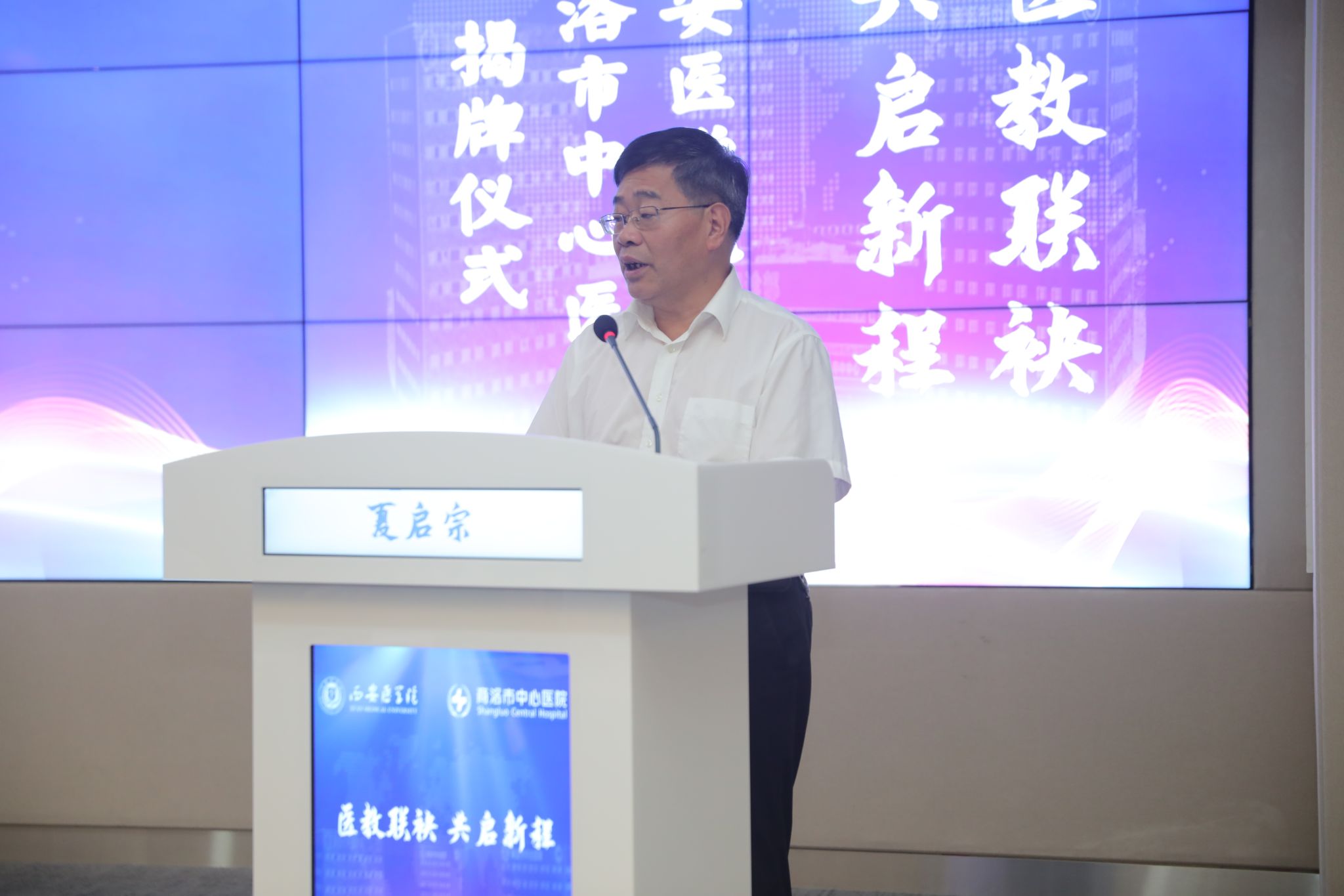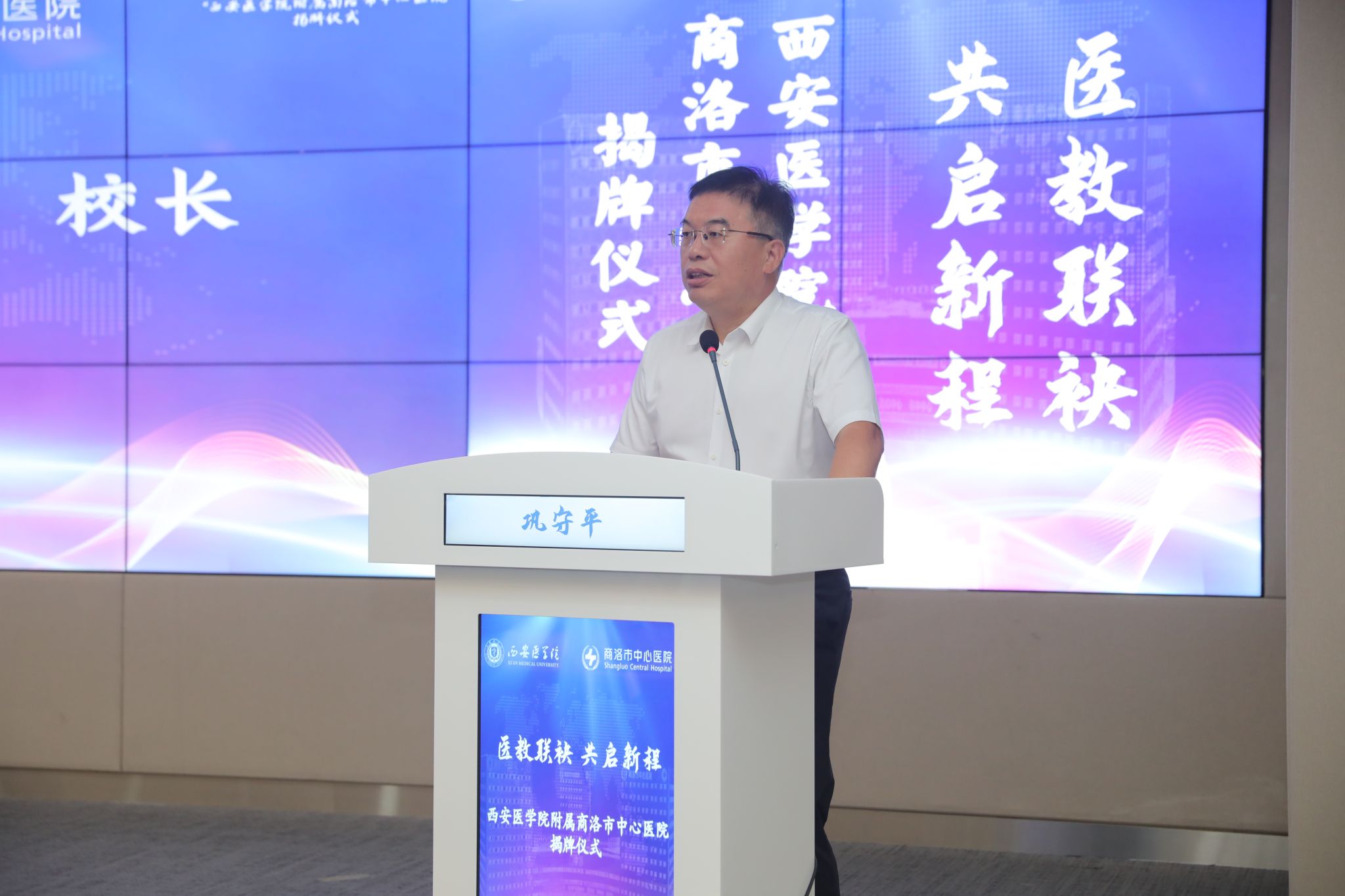 7月29日,我校与商洛市中心医院共建附属医院揭牌仪式在医院会议室举行。党委副书记、校长巩守平出席活动并讲话。党委副书记杨卓虎参加活动。商洛市人民政府副市长夏启宗,市中心医院党委书记李银山、院长唐红涛,医院领导班子其他成员和职工代表等出席活动。商洛市卫健委党组书记、主任马建琦主持揭牌仪式。