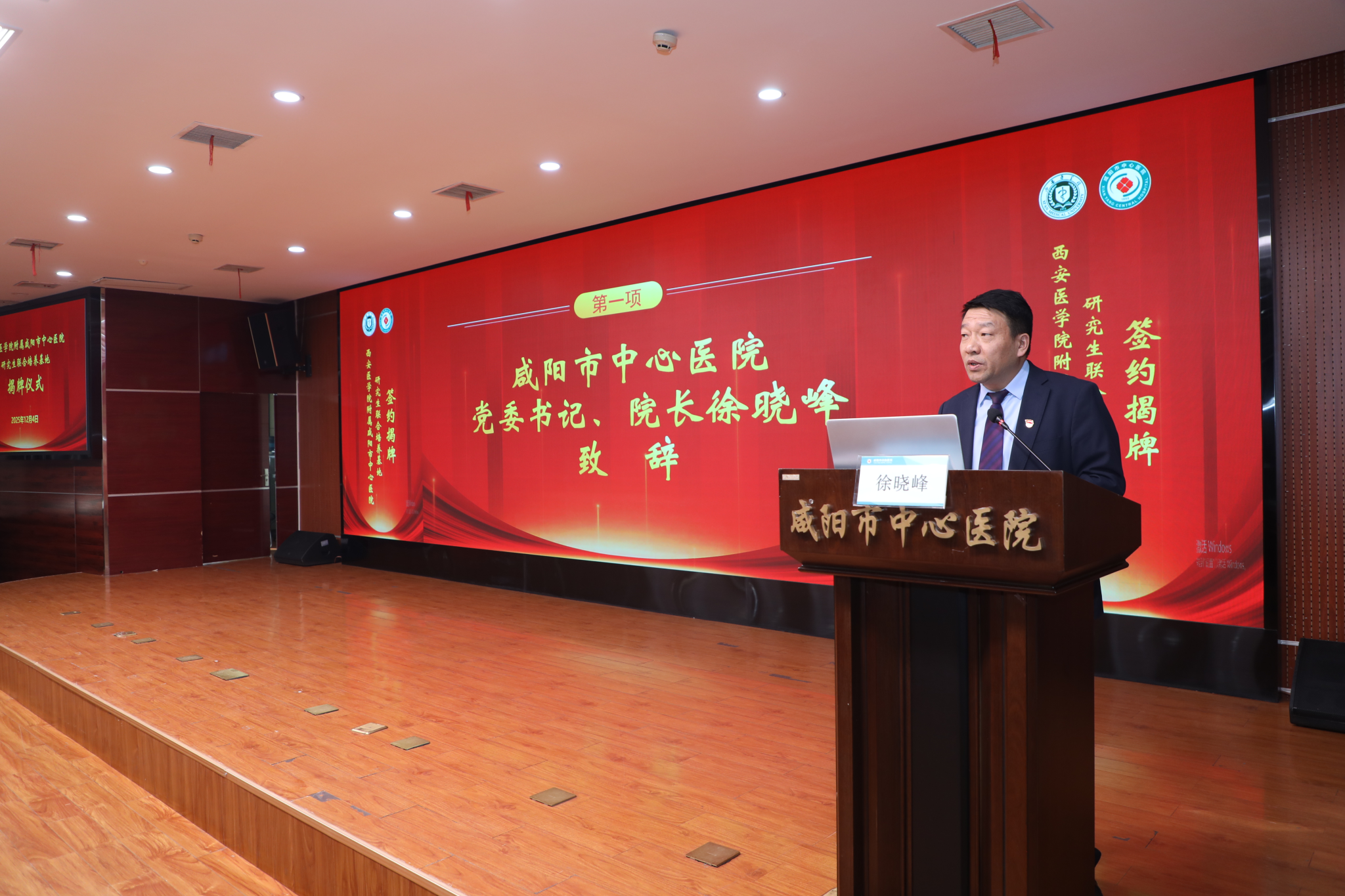 12月4日,我校与咸阳市中心医院共建附属医院暨研究生联合培养基地揭牌仪式在医院会议室举行。校长巩守平出席活动并讲话。党委副书记杨卓虎参加。咸阳市人民政府办公室副主任王国玮,咸阳市卫健委党委书记、主任魏曙新,医院党委书记、院长徐晓峰及班子成员和中层干部、临床教师代表等参加揭牌仪式。医院副院长刘强主持仪式。