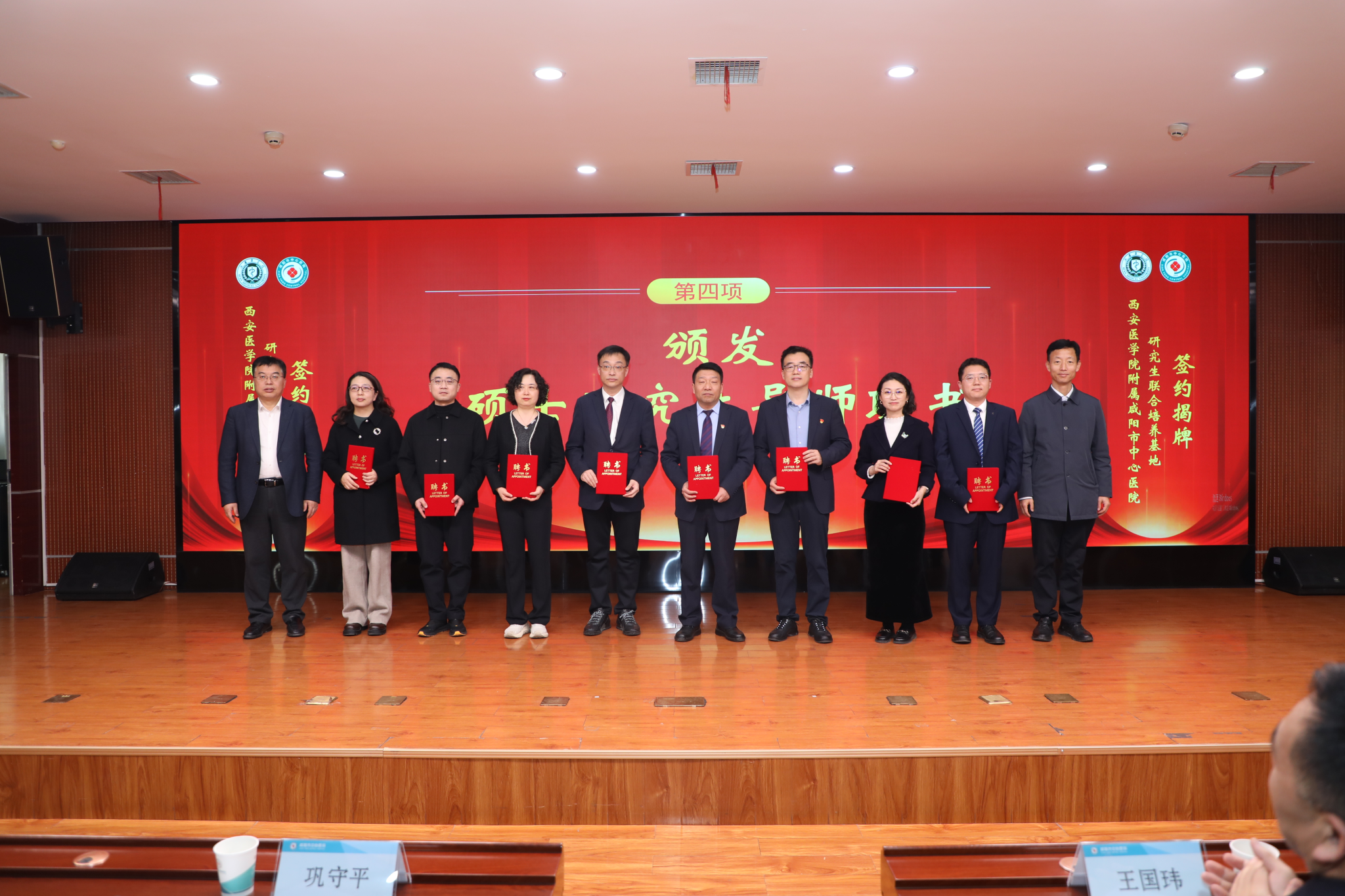 会上,杨卓虎和徐晓峰代表双方签订“leyu·乐鱼(中国)体育官方网站附属咸阳市中心医院”“leyu·乐鱼(中国)体育官方网站研究生联合培养基地”合作协议。巩守平、王国玮为“leyu·乐鱼(中国)体育官方网站附属咸阳市中心医院”揭牌;杨卓虎、魏曙新为“leyu·乐鱼(中国)体育官方网站研究生联合培养基地”揭牌;巩守平、杨卓虎为硕士研究生导师颁发聘书;医院研究生导师代表、我校2004级优秀毕业生高亭作为首次受聘的硕士生导师代表作表态发言。